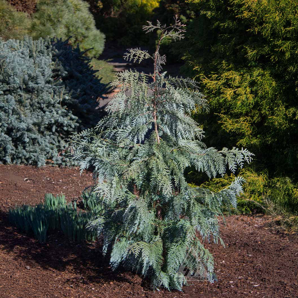 With large flat sprays of dusty blue foliage adorned with bright white stomatal bands underneath, this tree makes a striking addition to any garden. The unique coloration serves as a delightful contrast against traditional greenery, injecting a sense of calm and serenity into the landscape. The branches exhibit a wonderfully informal habit, cascading gracefully from the main trunk and creating an open structure that allows for air circulation and light penetration.